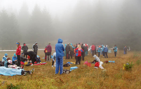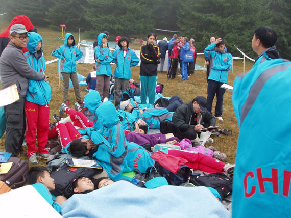 At the ARDF World Cup prior to the World Championships, there is no limit to the number of competitors from each nation. The Chinese delegation was by far the largest. In this photo, they're trying to stay warm before their times to start. (WB6RDV)