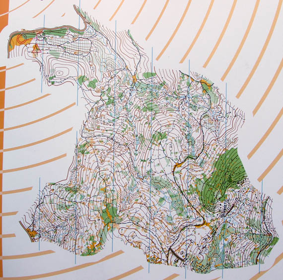This map was used for all four days of the ARDF World Cup, two days on two meters and two days on 80 meters. The start and finish (triangle and circle) are in the northwest corner. (WB6RDV)