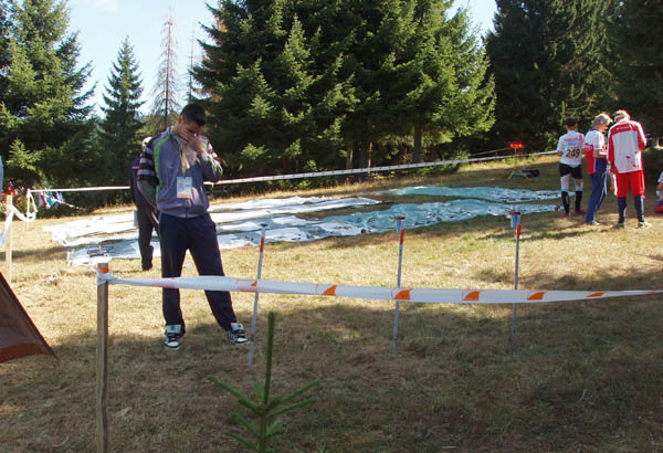 The World Cup starting area with stations for clearing and checking electronic scoring sticks, map preparation and equipment impound. (WB6RDV)