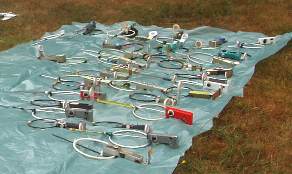 Closeup view of the 80-meter equipment in impound. These sets use loop antennas, but there were others on another tarp with ferrite rod antennas. (WB6RDV)