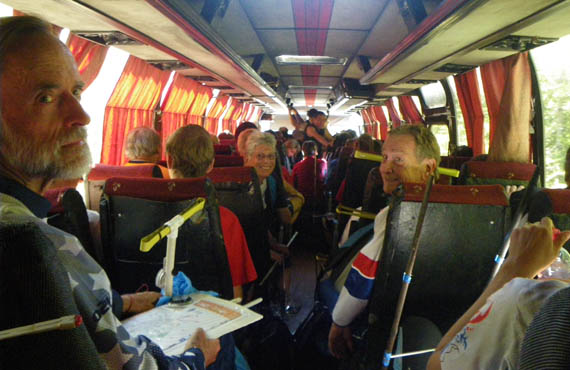 On the bus to a competition site are Bob Cooley KF6VSE, Ruth Bromer WB4QZG and Jay Hennigan WB6RDV. (K5JGH)