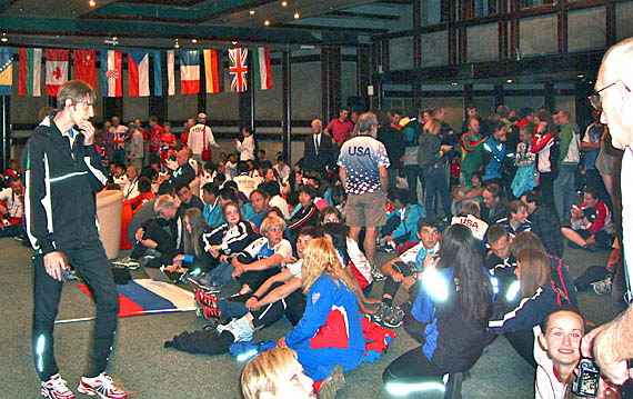 All the chairs in the hall were removed after dinner, so everyone sat on the floor for the ARDF awards ceremony. But they had to stand up for each national anthem. (WB6RDV)