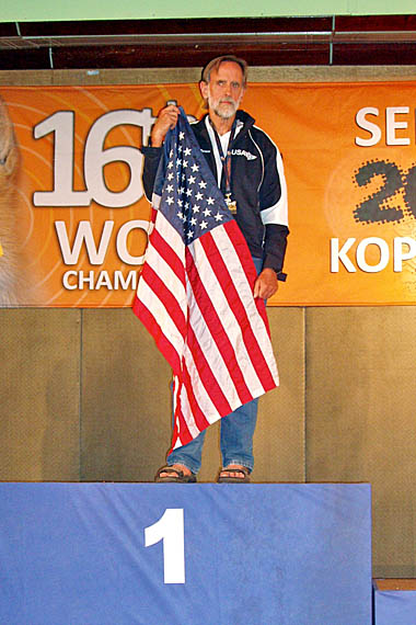 On ARDF competition day 1, Vadim Afonkin KB1RLI earned a gold medal for USA for his 80-meter run in M40 category. (WB6RDV)