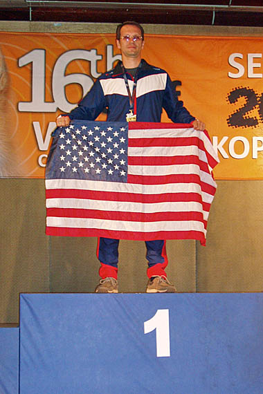 On the first competition day of the World Cup, Jay Hennigan WB6RDV had to compete in street clothes. His luggage was lost when his flight was delayed. (WB4QZG)